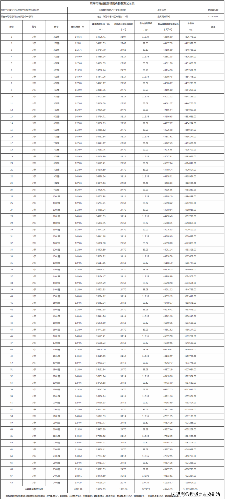 项目位于香洲区吉隆街112号,本次共有68套住宅公布备案价格,销售住宅总建筑面积8782.99㎡,户型面积为113.75-182.51㎡。