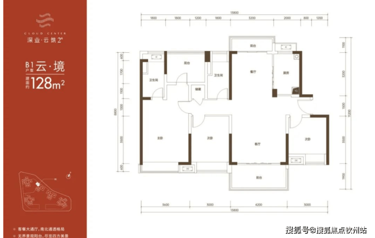 128㎡的4房2厅2卫,B1户型,仅5栋B单元的03号房才有,设计的是竖厅格局,南北通透双阳台,客厅4.2米开间,4个卧室分别做到了主卧19.44㎡/次卧12.3㎡/次卧12㎡/次卧10.5㎡(含墙体飘窗),得房率:79.71%(不含赠送),大阳台主朝正南向。