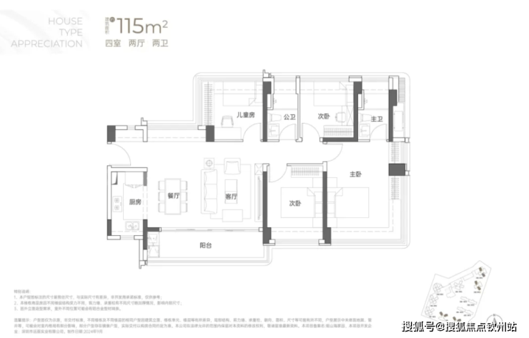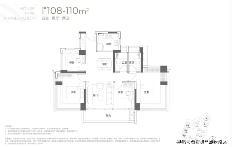 108-110㎡4房2卫户型:为西南向或东南向,竖庭设计,南北通透,阳台也是连通到次卧对出,比较宽敞。