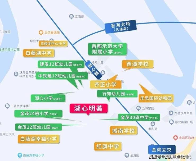 湖心新城规划27所全龄段学府,包括15所幼儿园,8所小学,4所中学,项目周边5km内已有金湾一小、白藤湖小学、城南中小学、珠海实验中学、红旗中学等;海量优质教育配套,为孩子造一个菁英未来。(来源:珠海西部中心城区A片区控制性详细规划(2017年修编))