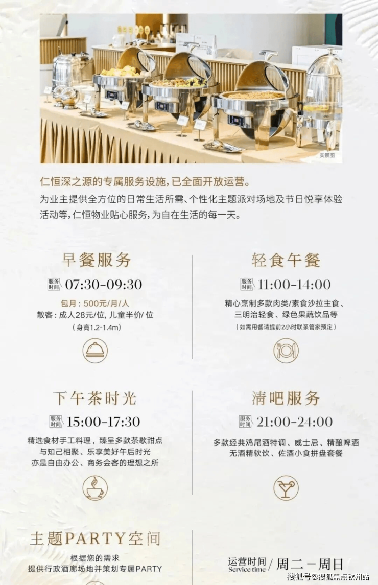 ◎优雅逸境行政酒廊,以“开放式设计+订制化服务”的运营理念,构建“圈层社交+个人私享”的全新体验,提供自助早餐(500元/月)、轻食午餐预定服务,供业主及来宾悠享,全天候多为社交场景+户外露台,可预约包场定制主题派对等专属生活场