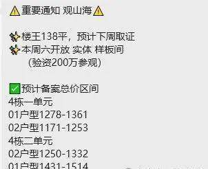 观山海家园开放138㎡样板房,先推4栋64套,预计下周取证,7月底入市。价格已经曝光,4栋一单元1100-1275万,4栋二单元1250-1514万,还有额外2X万-3X万的媒体返利优惠!具体扫码预约咨询!