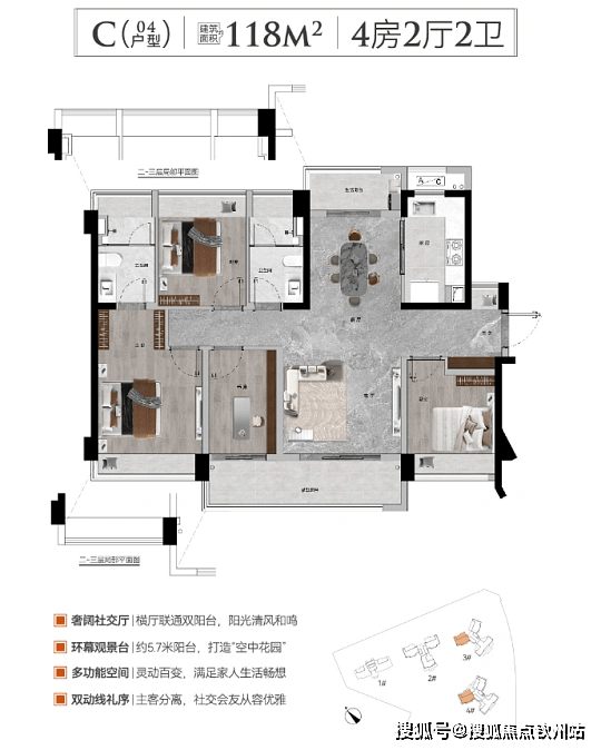备案均价约 1.8 万 /㎡,2026 年 1 月折后单价 1.4-2.3 万 /㎡,折后总价 138-310 万 / 套。具体户型分布:3、4 号楼为 2 梯 4 户,涵盖 91㎡、104㎡、118㎡户型;2 号楼为 2 梯 3 户,涵盖 125㎡、126㎡、128㎡户型,均为精装交付。