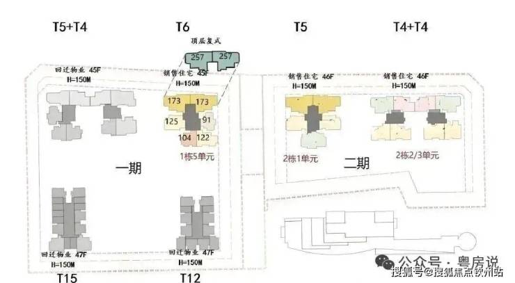 首推一期1栋5单元(45层),91-173㎡3-4房,共232套,以122-175平米4房为主,占比83%,还有两套257平顶复产品。173/257平大户型双电梯独立电梯厅入户,南区91-125平户型3梯4户。