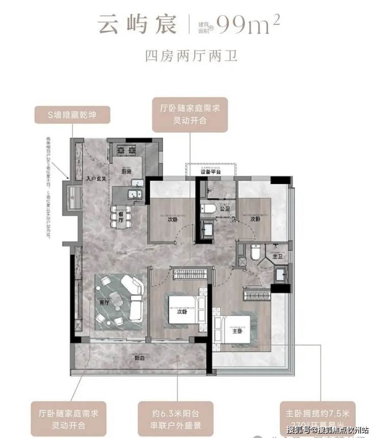 作为这次推售的主力户型,可以说是 “刚需上车 4 房的最优解”。同样延续三开间朝南、LDKB 一体化设计,客厅连接次卧打造 9.37㎡大阳台,洗衣晾晒与休闲观景两不误。4 个房间满足多孩家庭或三代同堂需求,主卧 270° 飘窗 + 设备平台赠送,得房率(含赠送)直逼 100%,让 “小面积住出大尺度” 成为现实。