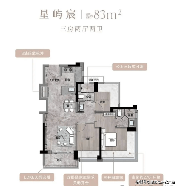 83㎡的3房2厅2卫,设计的是经典竖厅格局,客厅3.35米开间,LDKB一体化,S墙设计预留双开门冰箱卡槽位,三开间朝南,动静分区,U型厨房,公卫三段式干湿分离,赠送1.98平设备平台,得房率约77.15%(不含赠送),阳台5.02m²西南或东南朝向。靓点:83平做到了3房2卫,主卧270°无柱转角飘窗,厨房烟道外置+额外赠送设备平台,并且是纯南向格局。