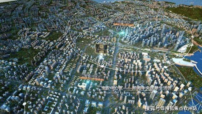 中国湾区,世界前延前海自贸区,粤港澳世界大湾区核心,多重国家战略支撑,中国未来经济新引擎。前海与宝中双核辐射区,多轴交汇。
