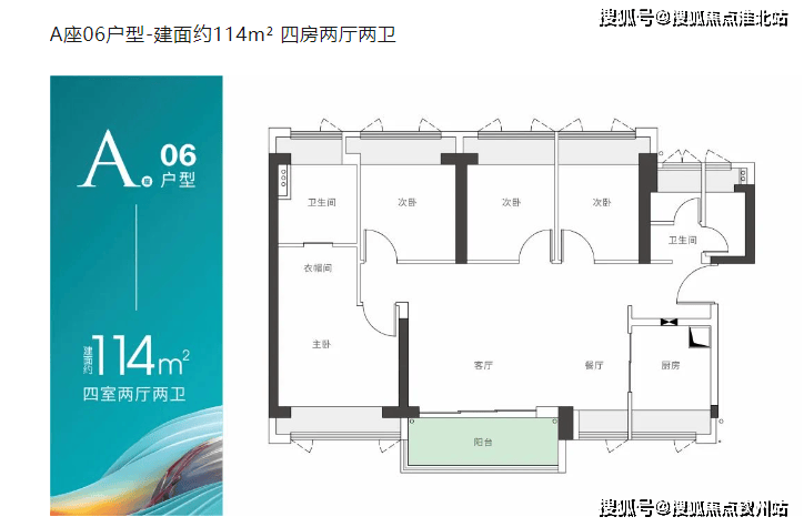 114㎡的 4 房 2 厅 2 卫:横厅南北通透格局,进门入户玄关,客餐厅实测 6 米开间,LDKB 一体化设计,4 个卧室分别为主卧 15.25㎡、次卧 9㎡、次卧 8.1㎡、次卧 7.9㎡,U 型厨房,公卫三段式分离,得房率约 76.2%,阳台主朝西南或东南向。