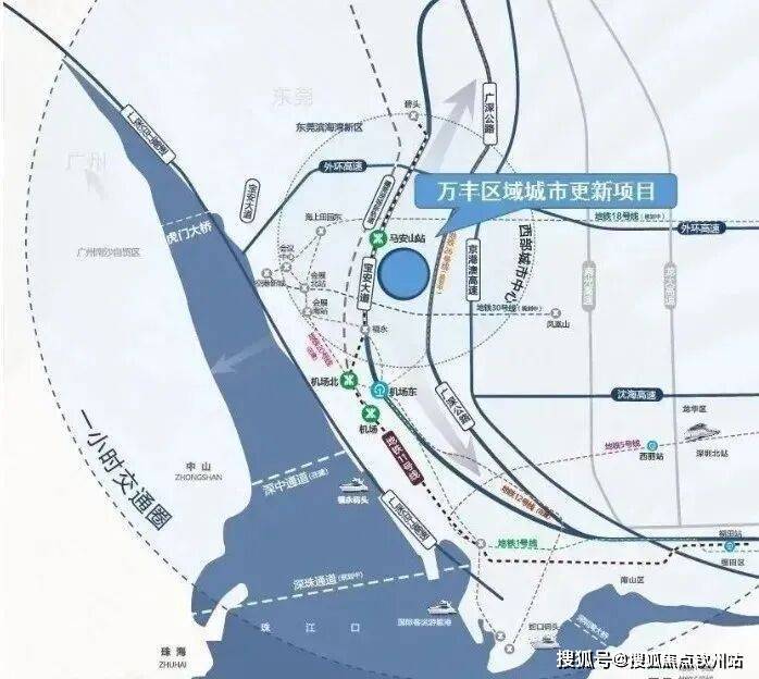 从宝安机场客运码头出发,可以到达香港、澳门、广州、珠海、中山5座城市。陆路交通已经形成“两横三纵”,“两横”是项目南北两侧的南环路、新沙路,“三纵”是项目西侧宝安大道、东侧中心路和107国道。高速方面拥有“四大高速”,广深高速、京港澳高速、广深沿江高速、外环高速等。深中通道预计2024年建成通车。