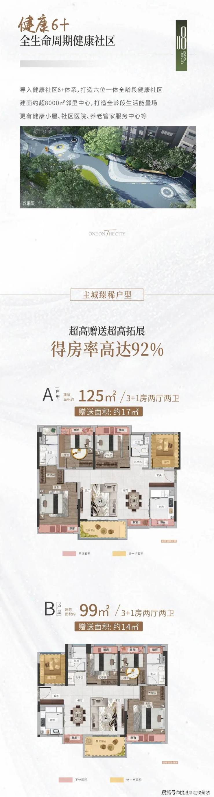 小区内部在大量的人群洞察调研之下,旨在营造新一代的健康高端城市生活,在绝佳主城核心的地段加持之下,打造“健康科技、健康环境、健康建筑、健康生活、健康园林、健康物业”六位一体的全龄健康6+高端生活体系体。全周期健康器械,以科技智慧诠释生活的人性化;从用水、空气、隔音、灯光四大方面,呵护生活;从材料、工艺、环保等方面打造金级健康建筑;约86112平方呎的邻里中心,无处不在的健康微配套;全龄私享健康园林及架空层空间、8000平方呎户外泳池会所;24小时管家式服务,除了基础物业服务,提供家政、养老、健康服务等关注老、青、幼三代家庭成员,以满足全年龄段业主的综合型健康生活需求。