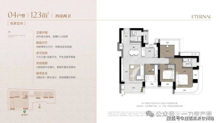 02产品介绍近1:1梯户比,大户型双电梯独立电梯厅入户,北区2梯2户,双电梯独立电梯厅入户,南区3梯4户。
