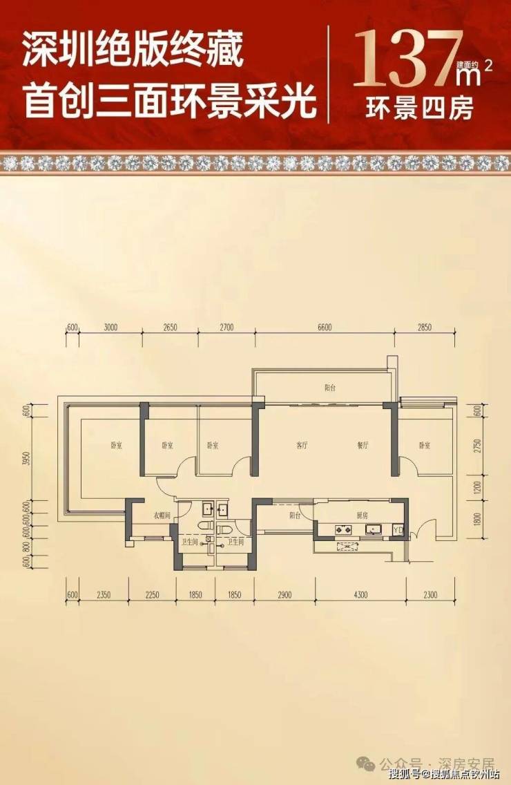 137㎡的4房2厅2卫,是大横厅双阳台南北通透格局,客餐厅6.6米开间,LDKB一体化,五开间朝南,约93%超高使用率(含赠送)