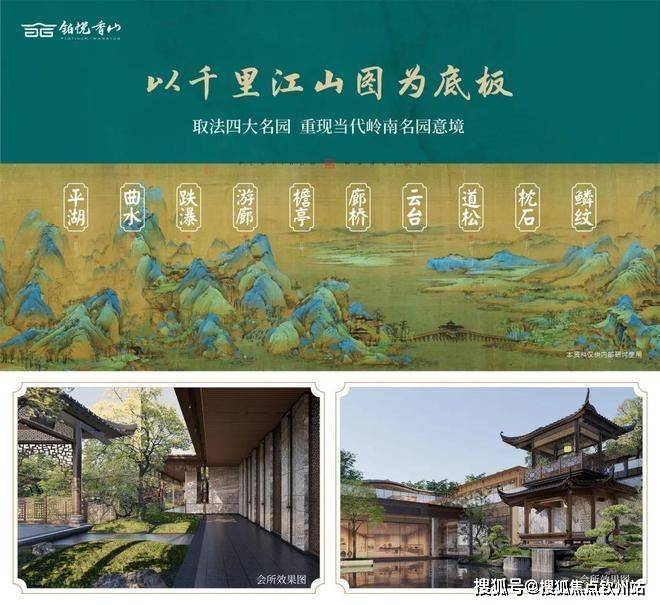 园林设计以《千里江山图》为灵感蓝本,巧妙融合岭南四大名园精髓,复刻佛山梁园"半边亭"。通过"漫卷云章"、"金水澜庭"、"琉璃水院"三进式景观轴线,呈现移步换景的东方美学。
