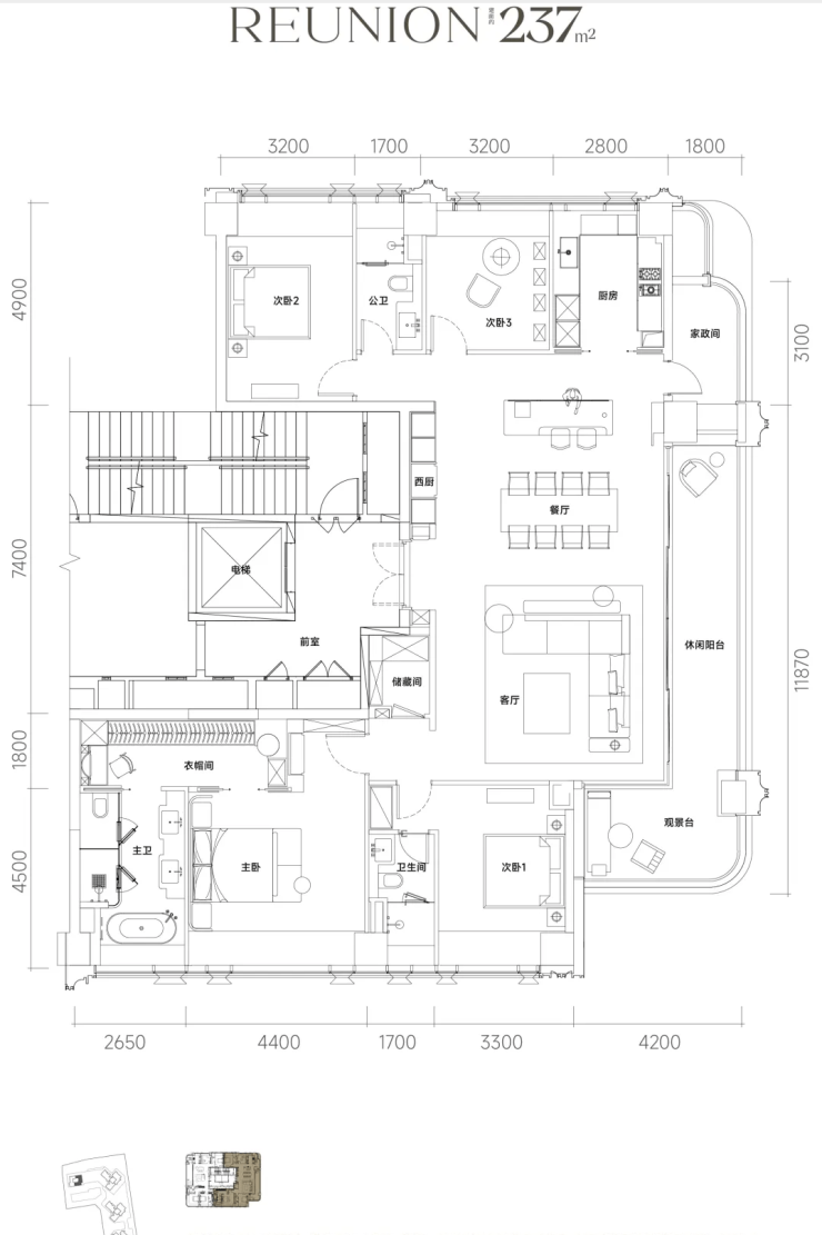 237㎡4+1房3卫户型阳台达11.8米,采用270°全景阳台最大化采光和观景效果,功能分区做得很好。采用一户一梯专梯入户,南北通透结构,是整个南山里非常稀缺的户型