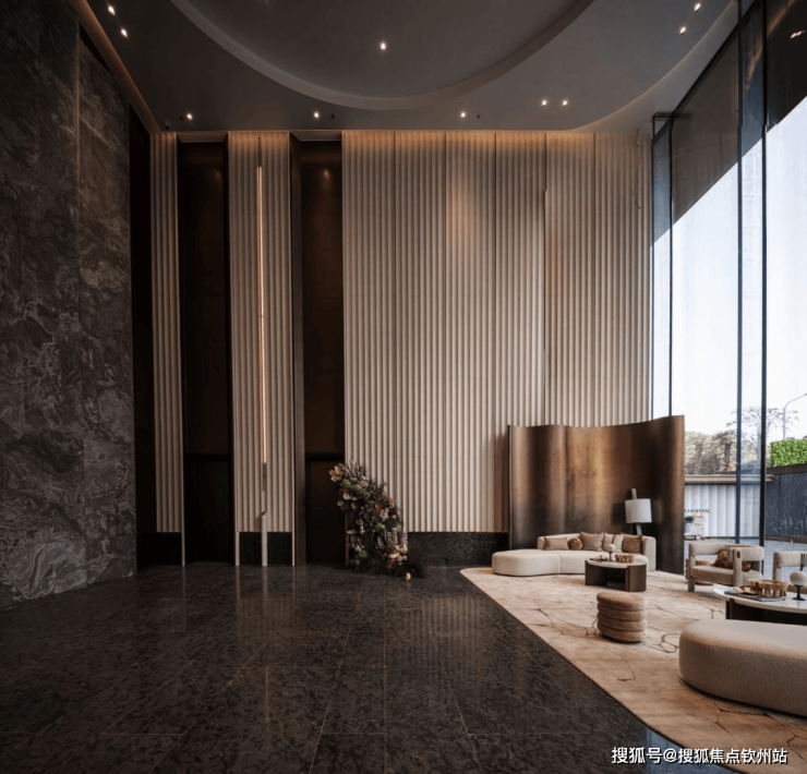 奢贵显赫的入户排场,由 上百块铂金钻拼接成宏大的奢石矩阵, 双层环岛水幕巧配范思哲黑,将城市文脉符号与酒店式奢宅基因完美融合。