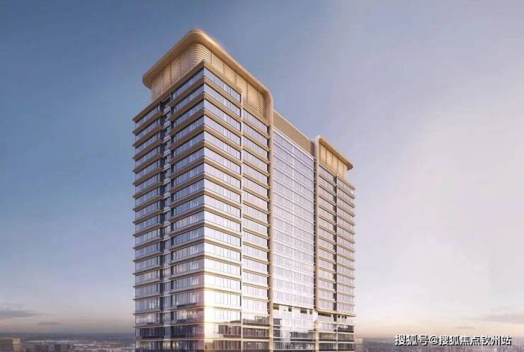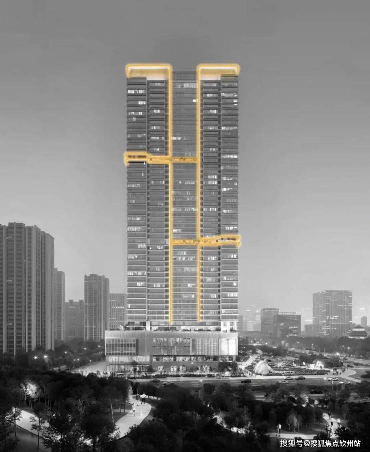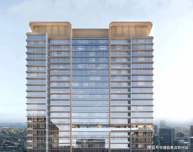 顶部 弧形金色线条自上而下延伸至避难层,曲线张力呈现出灵动柔和的艺术美感。