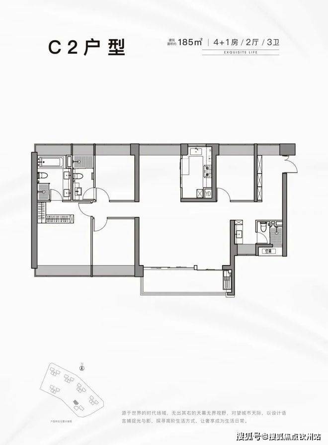 185平:5房2厅3卫,南北通透,使用率77.43%(不包含赠送)
