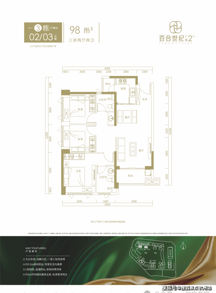 3栋02/03户型,设计的是竖厅格局,进门入户玄关客厅3.5米开间,LDKB一体化设计,三开间朝南,动静分区,正南朝向。
