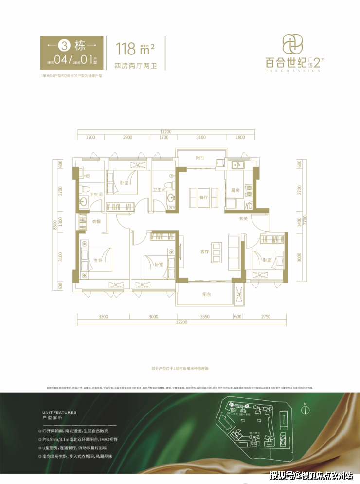 3栋1单元04/3栋2单元01户型,设计的是竖厅南北通透格局,进门入户玄关,客厅4.15米开间,客餐厅分离设计,南北双阳台,阳台主朝西南或东南向。