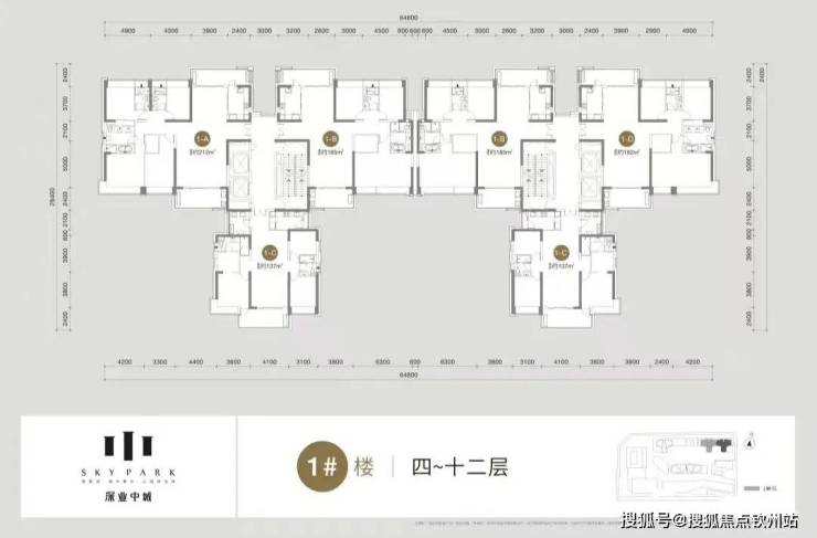 1栋:产品是面积段为137-185-192㎡的3房、212㎡的4房、以及4套300㎡以上的顶层复式单位,其中36层及以下为2梯3户“品”字形结构,37层及以上为2梯2户的板楼结构;