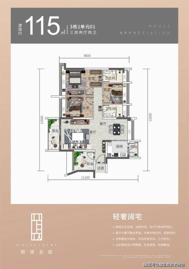 3栋1单元01户型,115平方3+1房两厅两卫,全景阳台,客餐厅一体化设计,营造显赫之感,主人房大套间设计独立卫浴,体验尊贵