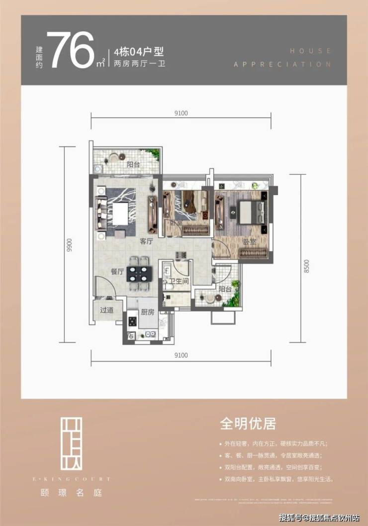 4栋02/03/04/05户型,76平方2+1房两厅一卫,创变空间,卫生间干湿分离,主卧朝南,阔景飘窗