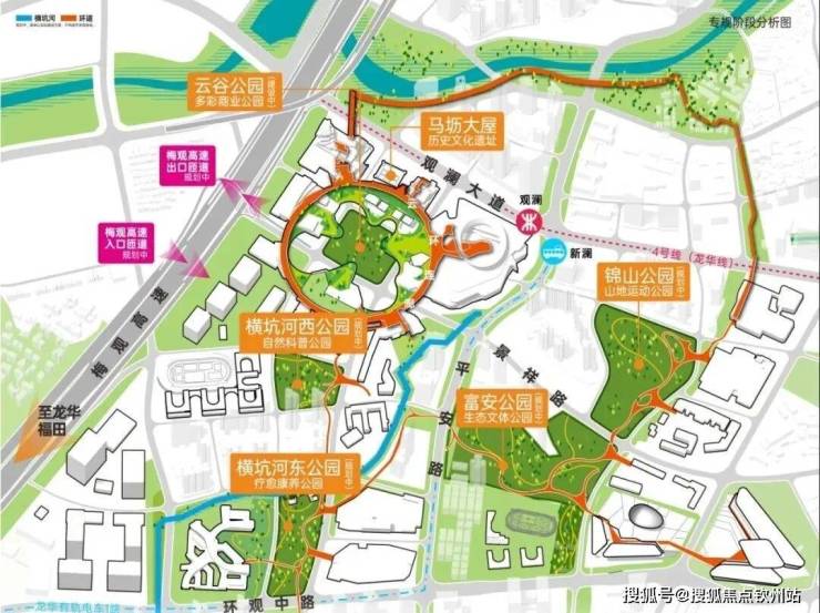深圳独创规划超3.6km空中连廊,串联5大公园,商业,住区、办公、文化休闲、生态康养等多个特色主题环游路线,超23公顷的生态公园。