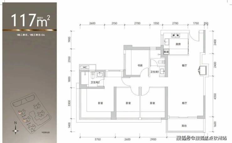 117㎡的4房2厅2卫,1栋2/3单元06户型,设计的是经典竖厅格局,客厅4米开间,四开间朝南,动静分区,4个卧室分别做到了主卧16.5㎡/次卧9.57㎡/次卧8.58㎡/次卧7.97㎡(包含墙体飘窗),得房率约90%(包含赠送),东南或西南朝向。