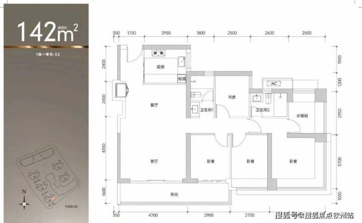 142㎡的4房2厅2卫,1栋1单元02户型,设计的是经典竖厅格局,客厅4.7米开间,四开间朝南,4个卧室分别做到了主卧24.03㎡/次卧9.99㎡/次卧8.99㎡/次卧7.6㎡(包含墙体飘窗),得房率约90%(包含赠送),东南朝向。