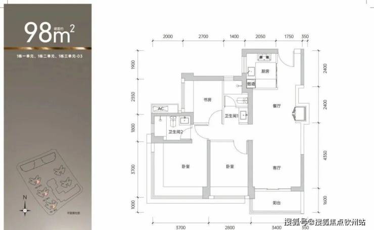 98㎡的3房2厅2卫,1栋1/2/3单元03.05户型,设计的是经典竖厅格局,客厅3.4米开间,三开间朝南,3个卧室分别做到了主卧14.3㎡/次卧10.36㎡/次卧6.75㎡(包含墙体飘窗),得房率约90%(包含赠送),东南或西南朝向。