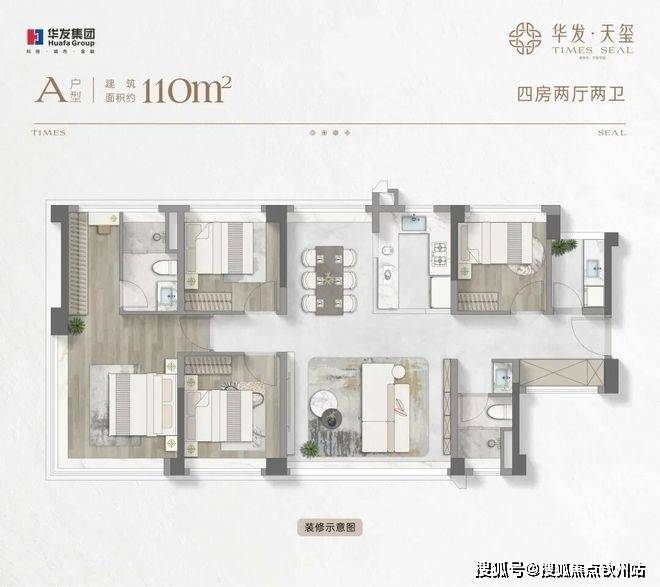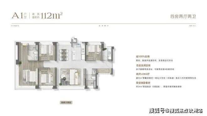 约110㎡四房两厅两卫:约16米通风面,户户是端户;约28㎡行政级端卧套房,270°景观视野,360°环统式采光;