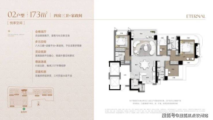 173m²的4房2厅3卫+家政间,竖厅类双龙抱珠格局,独立电梯厅入户约8.13㎡,客厅5.55米开间,LDKB一体化设计,主卧套房270°环幕凸窗+私享阳台,八大凸窗+设备平台+家政间,U型厨房,公卫三段式干湿分离。阳台正北朝向看会展中心+市民广场,得房率76%(不含赠送,套内面积131.98㎡)。