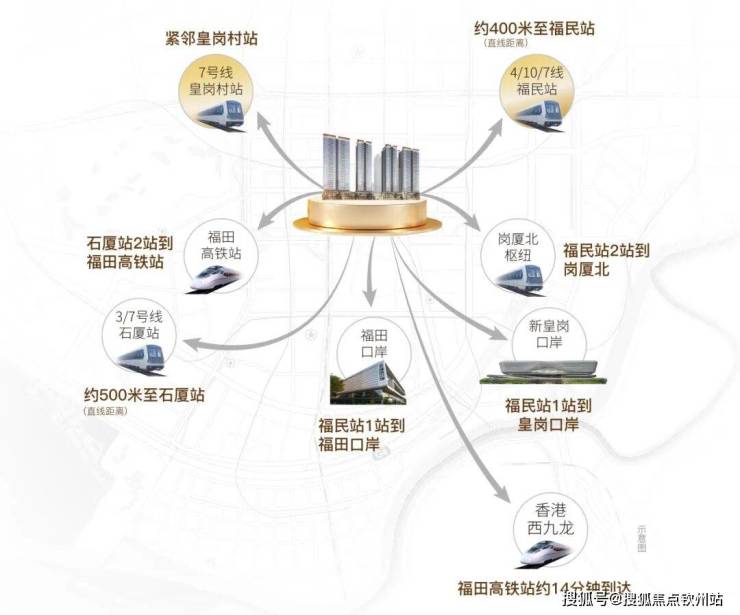交通配套:紧邻地铁7号线皇岗村站(E/D/C1/C2口直达),步行3分钟即可到达;距4/10号线福民站约300米,距3号线石厦站约500米,形成四线环绕的便捷网络。项目紧邻滨河大道、新洲路及粤港澳高速等主干道,10分钟车程覆盖福田CBD核心商圈,15分钟直达皇岗口岸,20分钟可达宝安国际机场。未来新皇岗口岸将于2026年投入使用,采用"合作查验、一次放行"通关模式,通关时间将从原来半小时左右缩短为5分钟左右。