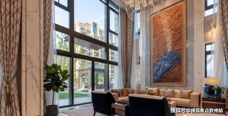 以约620-693㎡的样板房为例,设计为地上3层+地下1层,地上每一层层高达到3.6米,客厅挑高7.2米,开间做到了11.3米。
