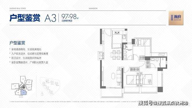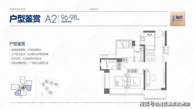 96-98㎡3房2厅2卫03/05/06(A2/A3)户型,设计的是经典竖厅三开间朝南格局,客厅3.5米开间,LDKB一体化,S墙设计预留冰箱卡槽位,主卧+1个次卧双飘窗。