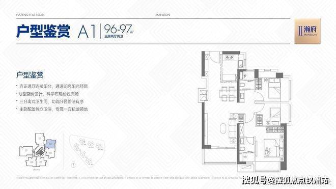 96-97㎡3房2厅2卫02(A1)户型,设计的是竖厅两个半开间朝东南,客厅开间3.5米,LDKB一体化,S墙设计预留冰箱卡槽位,动静分区,次卧东北向。
