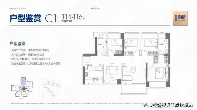 114-116㎡4房2厅2卫01(C1)户型,设计的是横厅朝东南向,客餐厅开间6.6米,LDKB一体化设计,四开间朝南,全屋7面飘窗,主卧套房+步入式衣帽间,3个次卧朝西北向。