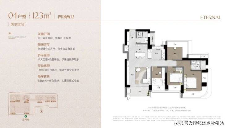 173m²的4房2厅3卫+家政间,设计的是竖厅类双龙抱珠格局,独立电梯厅入户约8.13㎡,客厅5.55米开间,LDKB一体化设计,主卧套房270°环幕凸窗+私享阳台,八大凸窗+设备平台+家政间,分别做到了主卧27.1㎡/次卧14.87㎡/次卧12.38㎡/次卧8.38㎡/家政间2.93㎡+阳台1.38㎡(实测面积,去掉墙体),U型厨房,公卫三段式干湿分离,得房率超90%(包含赠送),阳台9.56㎡正北朝向,看会展中心+市民广场。