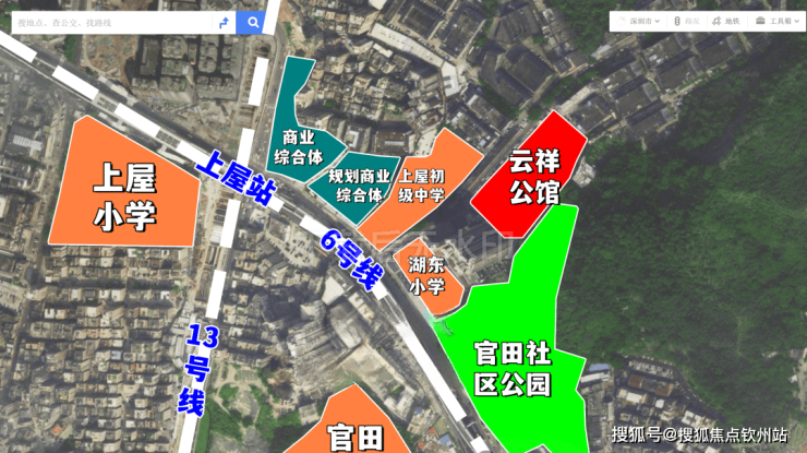 项目约直线距离400米抵达6号线、13号线(在建中)上屋站,6号线8站福田(翰岭站),13号线(建设中)4站南山、8站科技园(高新北站)。
