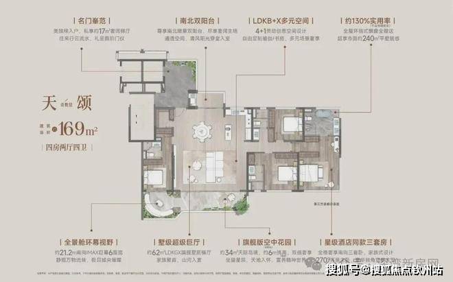 至高约130%实用率(不含电梯厅)媲美约200㎡大平层空间享受。约44㎡LDKG际会主场+约19.5米南向巨幕5.5面宽+约6米挑高空中花园+建面约36㎡、面宽约4.1米星级主卧套+全南4卧室、开间超3米+主卧270°全景视窗,成为世家专属的人居答案;