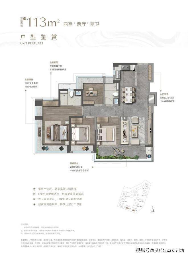 竖庭格局,西南向,基本居住功能与建面约108-110㎡4房2卫一致,但格局不一样,从目前公布的户型图上看,主要是主卧空间有了更大的提升,比如可以放更大一点的衣柜。