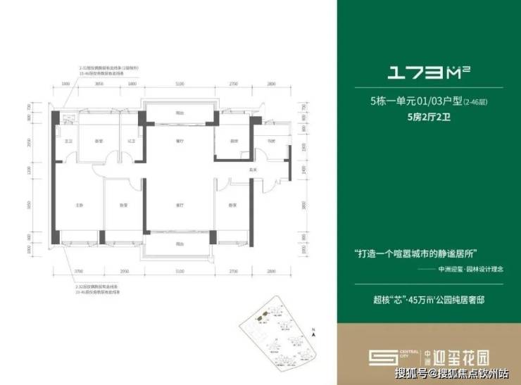 【五栋一单元-平面图】3梯3户,3条腿,分别是01、03号房户型约173㎡的5房2厅2卫、02号房户型约149㎡的5房2厅2卫