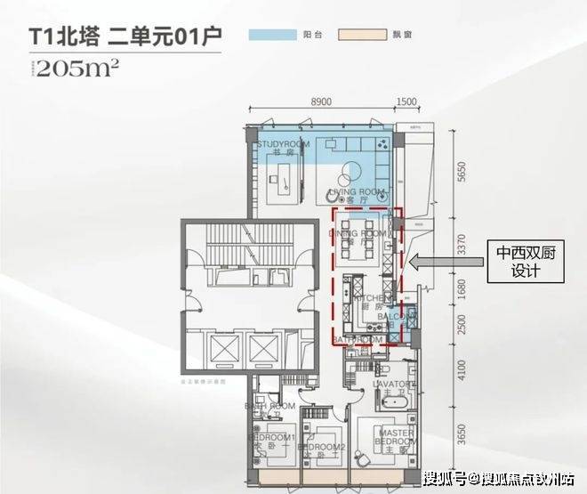 3、户型配置:4房2厅3卫(含书房),中西双厨房,双套房