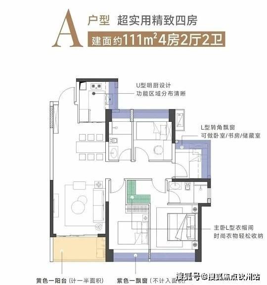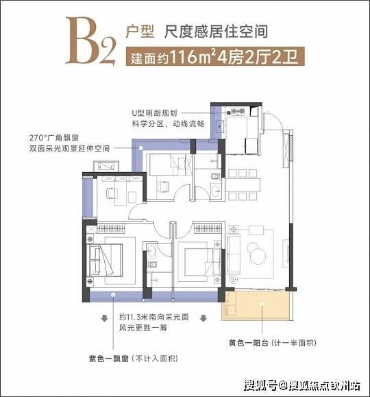 116㎡:四房两厅两卫,竖厅四开间朝南,部分次卧带 270° 转角飘窗(已售罄)