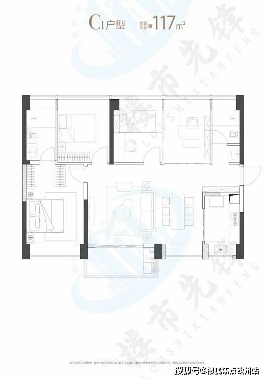117㎡:四房两厅两卫,横厅设计,南北通透,空间利用率高(已售罄)
