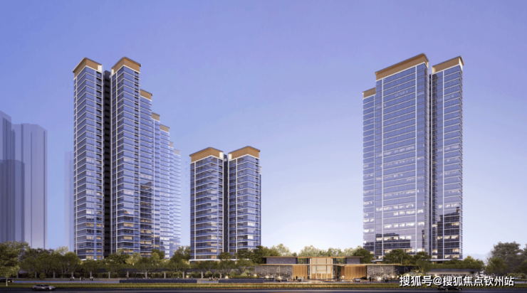 项目外立面采用大幅的玻璃幕墙,搭配简约暗金色调,极具豪宅感。