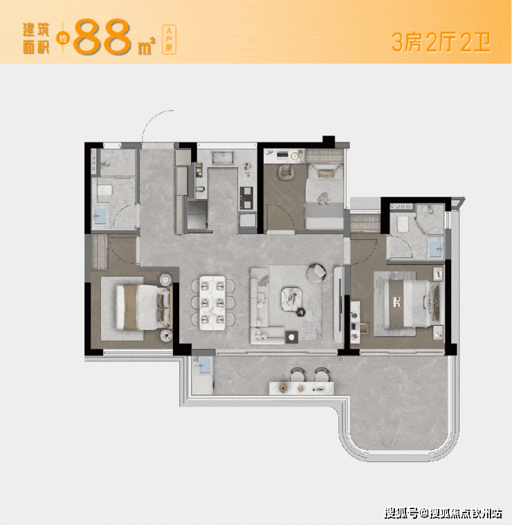 ·刚需户型(88-100㎡):三房设计,高实用性,双阳台