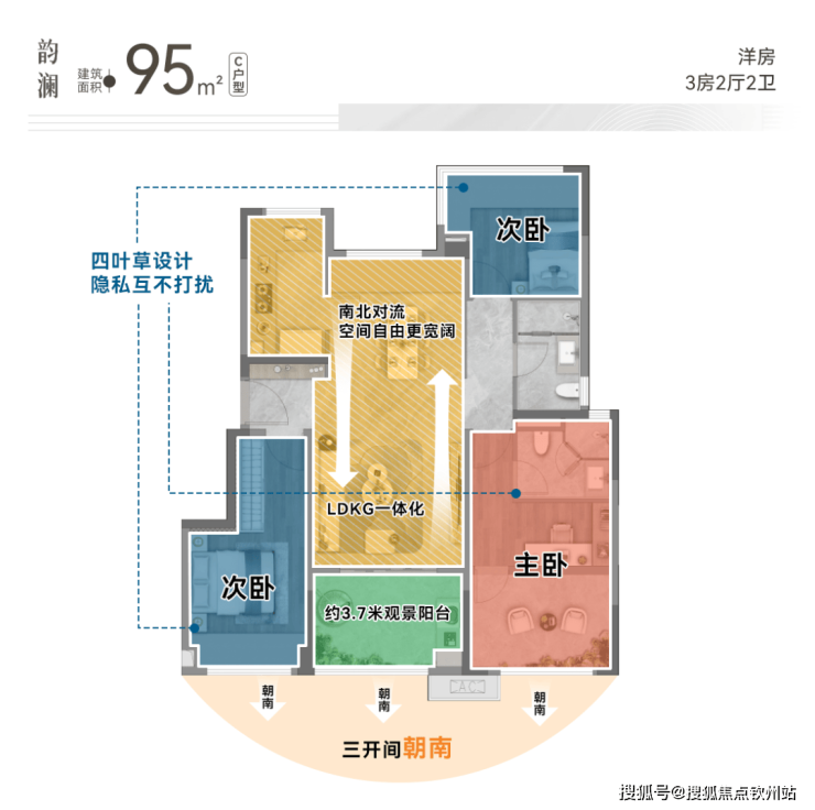 接下来,我们一起看看建面约95㎡的洋房户型,它创新性地采用了四叶草布局设计,三个卧室各自分布,为每一位居住者提供了充足且私密的个人空间。