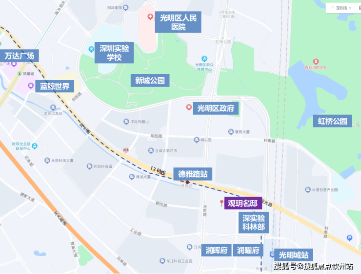 旁边就是润曜府、润晖府,东侧是待建的深实验光明科林部,不过观玥名邸靠着观光路,离13号线的德雅路站更近,仅300米左右!