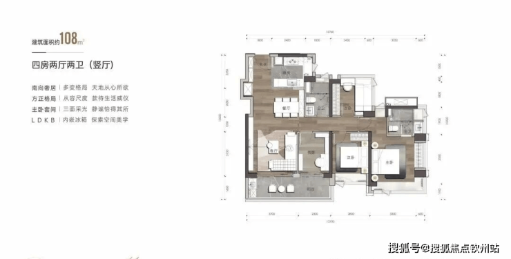 建筑面积约108㎡户型-4房2卫(竖厅)